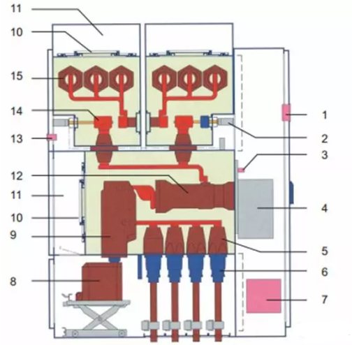國內(nèi)則主要是西安森源聯(lián)合開發(fā)的GZX系列,額定電流在2500A及以下,其結(jié)構(gòu)如下圖:(目前市場上主要是側(cè)擴(kuò)和頂擴(kuò),單氣室,雙氣室,三氣室的等)國內(nèi)代表性廠家主要有常州太平洋,寧波天安,正泰,順德開關(guān)等。