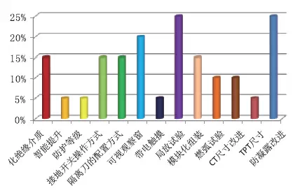 通過(guò)調(diào)研被參與者心中新產(chǎn)品哪些部分應(yīng)當(dāng)進(jìn)行優(yōu)化,認(rèn)為應(yīng)優(yōu)化絕緣介質(zhì)部分的占比15%,智能提升部分的占比5%,防護(hù)等級(jí)部分的占比5%,接地開(kāi)關(guān)操作方式的占比15%,隔離刀的配置方式的占比15%;可視觀察窗的占比20%,帶電觸摸的占比5%,局放試驗(yàn)的占比25%,模塊化組裝的占比15%,燃弧試驗(yàn)的占比10%,CT尺寸改進(jìn)的占比10%;TPT尺寸的占比5%,防凝露改進(jìn)的占比25%。如圖15所示。