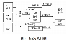 2.6智能電源環(huán)網(wǎng)柜的操作安排、控制器、通訊終端等二次設(shè)備都需求完結(jié)不間斷供電。為了前進(jìn)供電的可靠性,要求在供電電源失電時(shí),二次回路依然會(huì)有電源,能夠繼續(xù)可靠的動(dòng)作,環(huán)網(wǎng)柜中有必要具有備用電源。為了前進(jìn)供電電源的可靠性本電源的規(guī)劃首要選用了如下方法:(1)環(huán)網(wǎng)柜一般選用雙進(jìn)線,兩條進(jìn)線互為備用給電源的充電模塊供電,當(dāng)其中一條進(jìn)線失電時(shí),由繼電器將另一條進(jìn)線的220V電源轉(zhuǎn)給充電模塊,確保整個(gè)柜子的二次回路繼續(xù)供電。(2)當(dāng)環(huán)網(wǎng)柜的兩條進(jìn)線都失電的時(shí)分,為了使二次回路繼續(xù)帶電,需求由備用電源繼續(xù)供電?,F(xiàn)在首要的備用電源是不間斷電源(UPS)和蓄電池,還有的選用超級(jí)電容供電。為了前進(jìn)供電的可靠性,本電源方案選用蓄電池與超極電容相結(jié)合,兩種電源可互為備用,能夠進(jìn)一步前進(jìn)供電的可靠性。智能電源的方案如圖2所示。