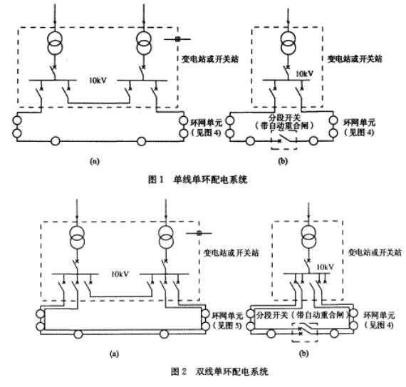 環(huán)式配電體系一般分為開(kāi)環(huán)和閉環(huán)兩種方法,因?yàn)殚]環(huán)方法繼電保護(hù)裝置整定困難,實(shí)踐很少選用。為了限制體系短路容量,簡(jiǎn)化繼電保護(hù),環(huán)式配電體系應(yīng)選用開(kāi)環(huán)方法。開(kāi)環(huán)方法的環(huán)式配電體系有“單線(xiàn)單環(huán)”、“雙線(xiàn)單環(huán)”、“雙線(xiàn)雙環(huán)”之分,典型接線(xiàn)圖見(jiàn)圖1-3。