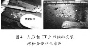 斷路器氣室內(nèi)部PT阻隔開關(guān)A相動(dòng)觸頭變形,未搭在接觸銅排上,端頭有明顯炙烤痕跡;B相動(dòng)觸頭端頭有燒傷痕跡;A相CT旁氣室壁有明顯燒傷痕跡;A相和B相CT上部銅排設(shè)備螺栓頭燒傷,斷路器室頂部方位有電弧燒傷痕跡,如圖4所示。