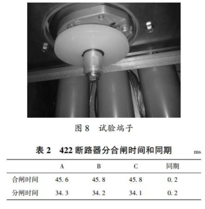 本次實驗選取422斷路器進(jìn)行機(jī)械特性查驗,按圖6進(jìn)行實驗接線。將4221阻隔開關(guān)置于接地方位,將實驗端子接到柜內(nèi)電纜接口,然后將實驗線接到實驗端子下端進(jìn)行實驗。實驗端子如圖8所示。422斷路器分合閘時間和同期見表2。