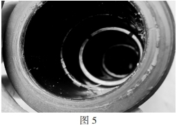 事端分支箱電纜終端所運用的硅脂密封功用不良,故障發(fā)生后,當拆撥其它兩相電纜頭時,由于硅脂出現(xiàn)干燥粘結(jié)(如圖5),需求多人合力才調(diào)撥出,可見硅脂已不能起到潤滑防潮與絕緣的效果,不能與電纜頭同“呼吸”,彈性功用大為下降。