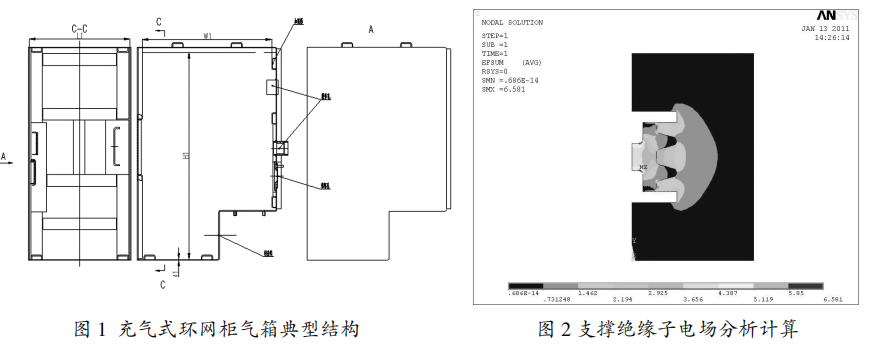 高壓帶電體對(duì)地最小間隙處在支撐絕緣子上,通過計(jì)算支撐絕緣子的電場(chǎng)如圖2,滿足電場(chǎng)要求,最終確定對(duì)地最小間隙。依據(jù)最小間隙準(zhǔn)則確定氣箱外形尺寸(L1xW1xH1)。