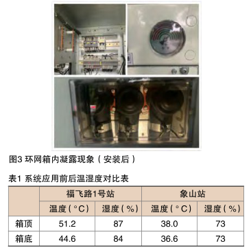 為檢驗(yàn)上述方案的實(shí)際運(yùn)行效果,在福州象山站安裝了一套上述微環(huán)境控制裝置(圖2)。為便于對(duì)比,在福州福飛路1號(hào)站安裝了環(huán)境監(jiān)控裝置,檢測(cè)柜內(nèi)環(huán)境參數(shù)。兩個(gè)環(huán)網(wǎng)站在同一天中,柜內(nèi)相同位置處最高溫濕度對(duì)比結(jié)果(表1)表明,安裝微環(huán)境控制裝置后,通過(guò)系統(tǒng)自動(dòng)調(diào)控風(fēng)機(jī)運(yùn)行的時(shí)間,降低環(huán)網(wǎng)箱內(nèi)空氣溫度,可促進(jìn)箱內(nèi)和電纜溝內(nèi)的溫濕度趨于均衡,減少電纜溝內(nèi)潮濕空氣通過(guò)電纜接線孔進(jìn)人開(kāi)關(guān)柜,從而防止開(kāi)關(guān)柜內(nèi)電氣元件表面的閃絡(luò)現(xiàn)象發(fā)生。系統(tǒng)運(yùn)行后二次艙和電纜艙凝露完全消除。