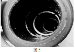 事故分支箱電纜終端所使用的硅脂密封功能不良,故障發(fā)生后,當(dāng)拆撥其它兩相電纜頭時,由于硅脂出現(xiàn)干枯粘結(jié)(如圖5),需要多人合力才干撥出,可見硅脂已不能起到潤滑防潮與絕緣的作用,不能與電纜頭同“呼吸”,彈性功能大為下降。