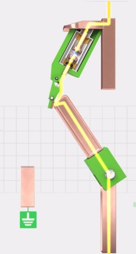 然后,電流通過處于閉合位置的真空滅弧室。接下來,在動觸頭的推動下,樞軸桿旋轉(zhuǎn)并驅(qū)使真空滅弧室開斷。