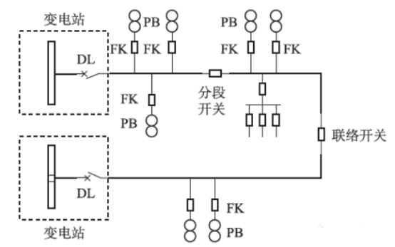如下圖所示,其作為現(xiàn)階段典型的配電體系拓撲圖,變電站的10kV出線裝備斷路器和對應維護,主線路中引證開關分段,各分支線路結合負荷開關的方法進行裝備,且全部開關都具有合閘等功用。由于分段開關與負荷開關在作業(yè)期間,難以斷開短路電流,所以不需求設備維護設施。其間,圖中的DL歸于斷路器,FK歸于負荷開關,而PB是配變。