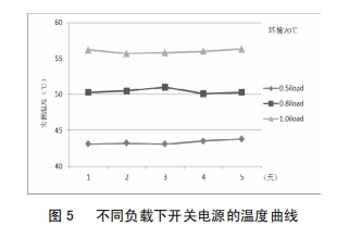 改善后,為考證改善作用,對(duì)開關(guān)電源分別在0.5倍、0.8倍及1.0倍負(fù)載下間斷了為期5天的帶負(fù)荷實(shí)驗(yàn),圖5為不同負(fù)載下開關(guān)電源的溫度曲線,由圖5可知,跟著負(fù)荷的增大,開關(guān)電源問題整體呈上升趨向;負(fù)載不變的情況下,同一溫度曲線根柢堅(jiān)持滑潤(rùn);開關(guān)電源在額定負(fù)載下作業(yè),最高溫度不超越57℃,未達(dá)報(bào)警值,開關(guān)電源牢靠性得到明顯前進(jìn)。