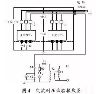 根據(jù)文獻(xiàn)關(guān)于高壓開關(guān)柜、電壓互感器、電流互感器、避雷器等章節(jié)要求,充氣柜的實驗項目應(yīng)包含斷路器、電壓互感器、電流互感器、避雷器等元件的例行實驗項目,考慮到充氣柜結(jié)構(gòu)的特殊性和現(xiàn)場運用的實用性,選取了交流耐壓試