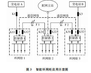 的區(qū)段,兩邊都能或者都不能檢測(cè)到故障信號(hào)的區(qū)段則不是故障線路,所以可快速容易的將故障點(diǎn)定位在K12和K21之間。開(kāi)關(guān)K12會(huì)跳閘,開(kāi)關(guān)K21保持分閘狀態(tài)并閉鎖,將故障區(qū)段切除。配網(wǎng)主站接收到隔離成功信息,通過(guò)調(diào)度自動(dòng)化系統(tǒng)將開(kāi)關(guān)K11合閘,恢復(fù)非故障區(qū)域供電。同理,當(dāng)在F2處發(fā)生故障時(shí),集中式智能控制器將采集到的故障信號(hào)傳輸?shù)脚渚W(wǎng)主站,配網(wǎng)主站對(duì)故障信號(hào)進(jìn)行分析和邏輯判斷。通過(guò)故障點(diǎn)處在兩邊感受到信號(hào)不通的區(qū)段的判據(jù),將故障定位在K22和K31之間。開(kāi)關(guān)K3會(huì)跳開(kāi)然后自動(dòng)重合,開(kāi)關(guān)K31、K22跳開(kāi)后不再閉合,將故障區(qū)段切除。配網(wǎng)主站接收到隔離成功信息,通過(guò)調(diào)度自動(dòng)化系統(tǒng)將開(kāi)關(guān)K21合閘,恢復(fù)非故障區(qū)域供電。在整個(gè)過(guò)程中,從發(fā)現(xiàn)故障到故障隔離最后將非故障區(qū)域恢復(fù)供電所需要的時(shí)間非常的少,能夠最大限度的提高供電的可靠性,這是采用智能環(huán)網(wǎng)柜的優(yōu)越性所在