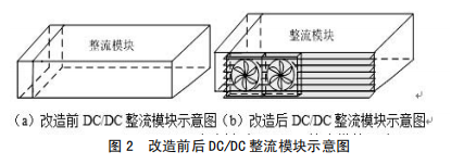 (1)在裝置功率元件一側(cè)加裝散熱片,并于散熱片上面裝設(shè)常規(guī)風(fēng)扇,從而擴(kuò)大散熱面積,增強(qiáng)空氣流通,起到散熱降溫作用,如圖3所示改進(jìn)前后示意圖。